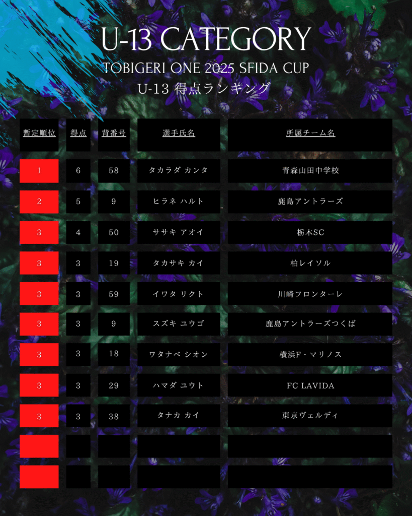 U-13 TOBIGERI ONE 2025 SFIDA CUP DAY1 結果速報🌟 2025年7月21日 お知らせ ダウンロードはこちらから) 🌟U-13カテゴリー🗓️2024年7月20日〜22日🏟️時之栖スポーツセンター@静岡県🔢32チーム開催 大会公式サイトはこちら 特別協賛:株式会社イミオ(SFIDA) 暫定得点王 各種SNSアカウント TOBIGERIオフィシャルショップはこちら \結果速報はX(旧Twitter)/ \選手たちのリアルな様子はInstagram/ \大会終了後はYoutube/ \おもしろ動画はTiktok/ \テキスト速報&イベントの裏側はThreads/ URL Copied!